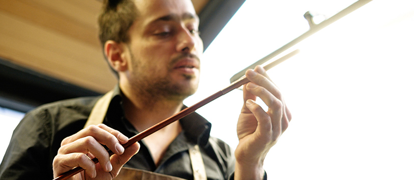 “Ik combineer de negentiende-eeuwe traditie van Pecatte en Sartory met moderne technieken. Bogen bouwen is geen exacte wetenschap. Ik vraag de klant altijd om een stukje muziek te spelen. Dan bestudeer ik zijn houding en zijn stijl. Op basis daarvan kies ik een stuk hout dat ik met de hand omvorm tot een unieke boog waarmee die unieke klant op zijn beurt het beste uit zijn unieke viool of cello kan halen.”
