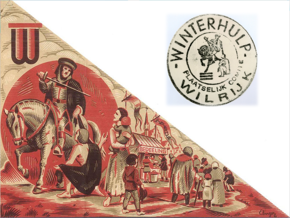 Toelichting: De heilige Sint-Maarten was een veelvoorkomende figuur op de Winterhulp-affiches. In het jaar 316 reed Martinus van Tours, een jong soldaat bij het Romeinse leger, Amiens binnen. Aan de stadspoort schenkt Martinus de helft van zijn mantel aan een bedelaar. De volgende nacht zou hij Christus hebben gezien met deze mantel om. Later trad Martinus van Tours uit het leger om als kluizenaar in een klooster te leven. Tot aan zijn dood werd hij omringd door tal van volgelingen. Door zijn milde gift werd Sint-Maarten het symbool van vrijgevigheid.
