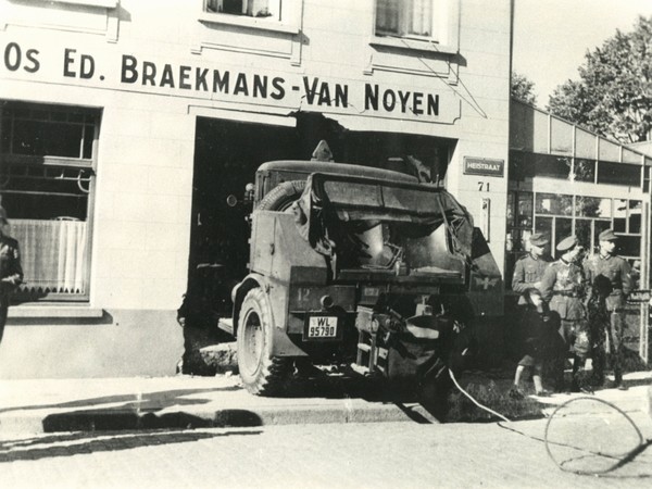 Zomer 1942. Ondanks de uitstekende weersomstandigheden verliest de chauffeur van een zware Duitse truck de controle over zijn stuur en beukt los door de inkomdeur, tot vóór de toog van café ‘Den Bonten Os’, aan het kruispunt Heistraat-Jules Moretuslei. Als bij wonder komt enkel de uitbater Eduard Braeckmans er met lichte verwondingen vanaf. De ongewone gebeurtenis lokte heel wat volk. Omdat instortingsgevaar dreigt wordt de kolos met de grootste omzichtigheid naar buiten getrokken en de toegang gestut.