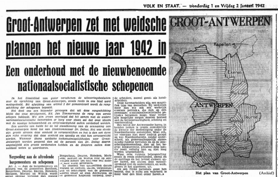 GROOT-ANTWERPEN | Op 1 januari 1942 wordt Groot-Antwerpen opgericht. Het Antwerpse college, in het bijzonder burgemeester Leo Delwaide, ziet de plannen wel zitten en drukt ze door. Ook de havenbonzen en andere economische spelers juichen de beslissing toe. Vijf maanden later gaan de randgemeenten Berchem, Borgerhout, Deurne, Hoboken, Merksem, een deel van Ekeren, Wilrijk maar ook Mortsel, op in de fusie. De gemeenteraden vallen weg, en de gemeenten houden op te bestaan.