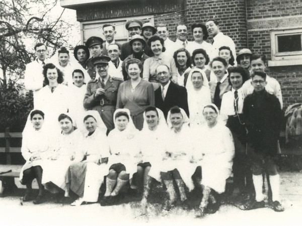 VRIJWILLIGERS RODE KRUIS | Ook de oprichting van een vrijwilligers Rode Kruisdienst staat op het programma. Hier staan ze afgebeeld met een stralende glimlach, maar naarmate de oorlog vordert, en vooral tijdens de periode onder de V-wapens, blijven verscheidene onder hen achter met een zwaar trauma.
