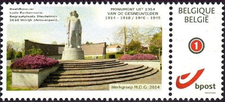 POSTZEGEL | Ter gelegenheid van 70 jaar Bevrijding drukt de Werkgroep MDG in 2014, in samenwerking met Bpost, een postzegel met daarop een afbeelding van het monument uit 1954 van de gesneuvelden uit 1914-1918 en 1940-1945 op de begraafplaats Steytelink 2014.