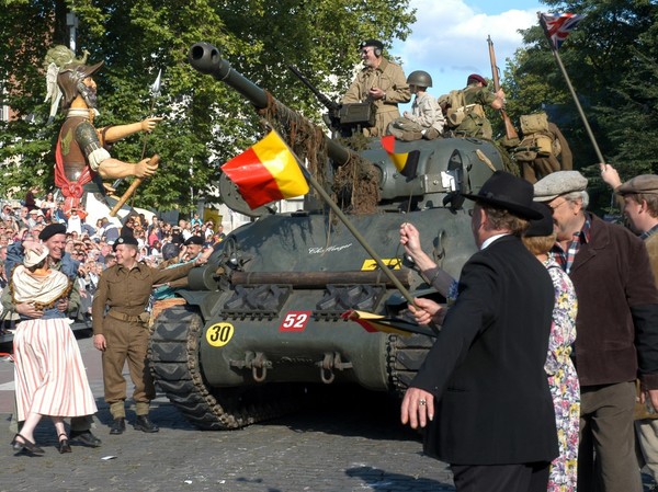 GEITESTOET 2005 | In de Geitestoet van zondag 18 september 2005, 60 jaar na de Britse bevrijdingsoptocht door Wilrijk, rijdt opnieuw een Shermantank en andere authentieke militaire oldtimers door de straten van Wilrijk. Een huzarenstuk! Net zoals zestig jaar geleden wordt er uitbundig gedanst, gekust en geapplaudisseerd. Omwille van de veiligheid was het voor al te enthousiaste omstaanders deze keer ten strengste verboden om op de tank te kruipen…