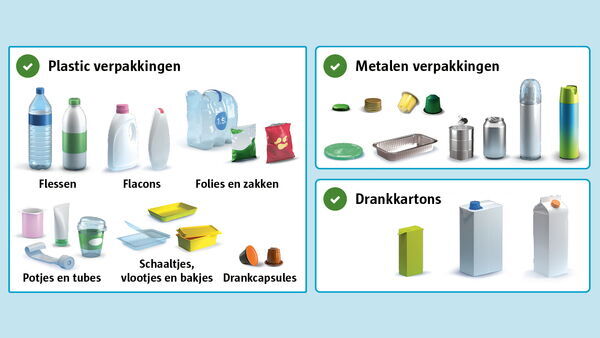 PMD staat voor Plastic verpakkingen, Metalen verpakkingen en Drankkartons.