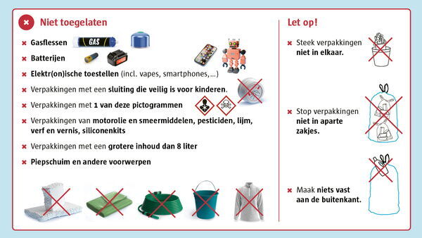 • Steek de verpakkingen niet in elkaar want anders worden ze niet herkend in het sorteercentrum en kunnen ze niet gerecycleerd worden