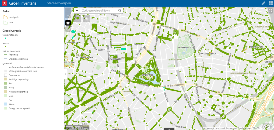 De groeninventaris is een digitale kaart van Antwerpen waar alle openbare groeninfrastructuur van de stad op weergegeven wordt. Elke groene stip is een boom, waar u ook extra informatie zoals de naam en de stamomtrek van de boom kunt vinden. Ook de namen en adressen van parken zijn te vinden op de kaart.