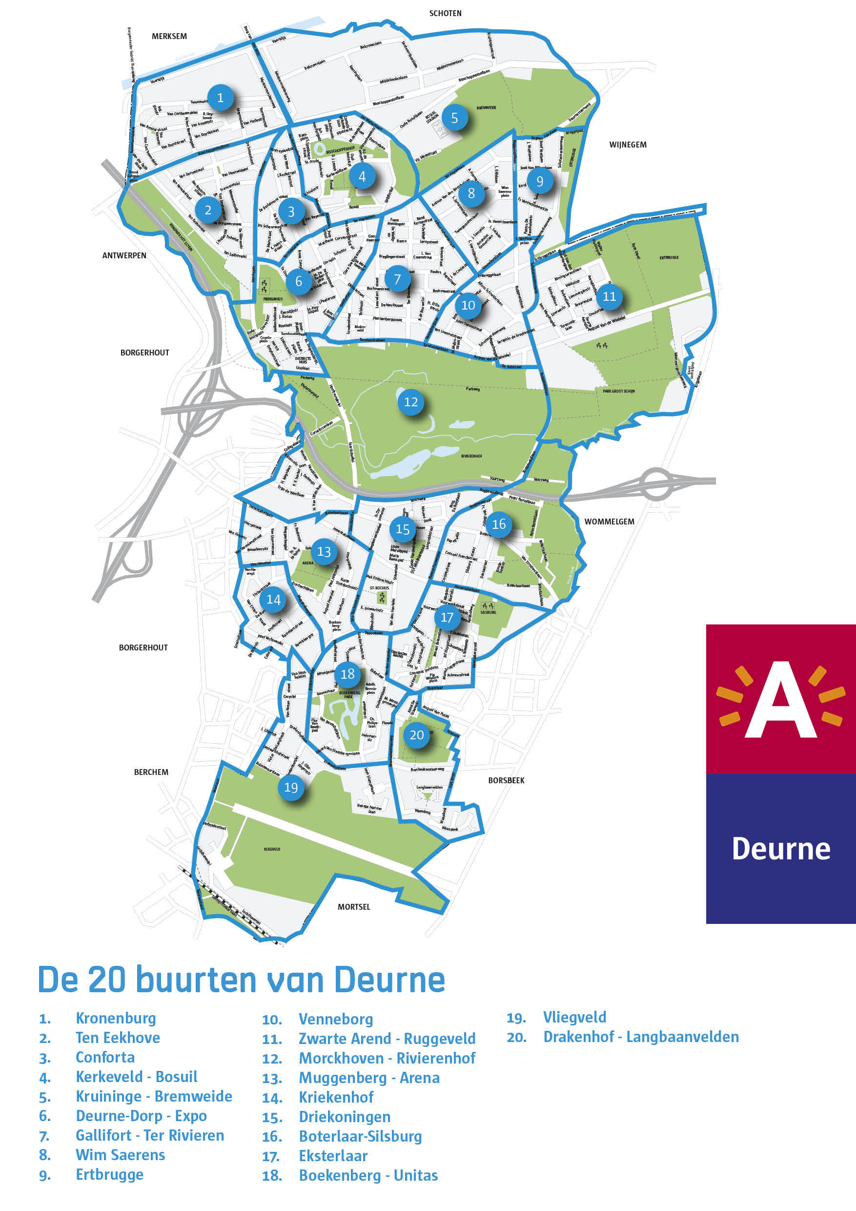 Onderaan deze pagina kan je het plan van Deurne met de indeling in 20 buurten (PDF) downloaden.