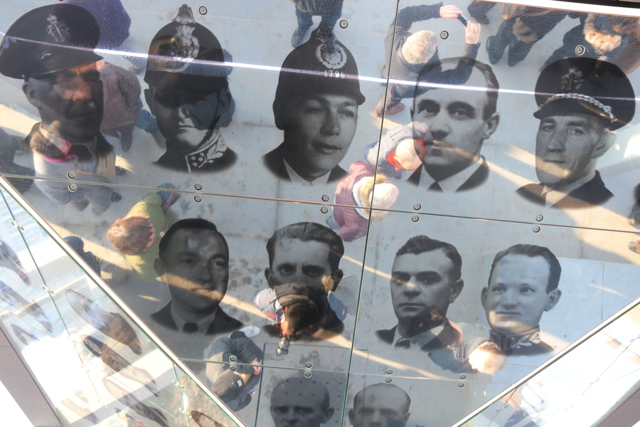 Het Vredesmonument bestaande uit granieten zuilen (voor alle politieagenten die gestorven zijn) en granieten banken (met de namen van de teruggekeerden) herinneren aan de gruwel van deze oorlog. Een aparte zuil met een spreekgestoelte herinnert aan burgemeester Alfons Schneider. Hij werd ook gedeporteerd en overleefde het niet. Centraal staat een omgekeerde piramide met afbeeldingen van de politiemannen. In de weerspiegeling ziet de bezoeker ook zichzelf en beseft dat hem dit ook had kunnen overkomen. Het water dat door de piramide neerwaarts sijpelt symboliseert hoe het leven toch telkens weer verder gaat. Wanneer de avond valt, siert verlichting de zijkanten van de piramide, als een troostend licht in de duisternis.