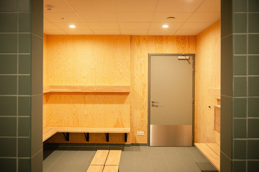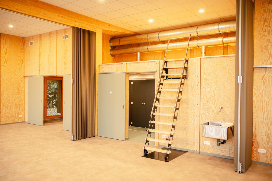 Het moderne paviljoen ligt midden in het groen en is ontworpen voor gedeeld gebruik, zodat zowel sport- als jeugdwerkactiviteiten elkaar niet storen.